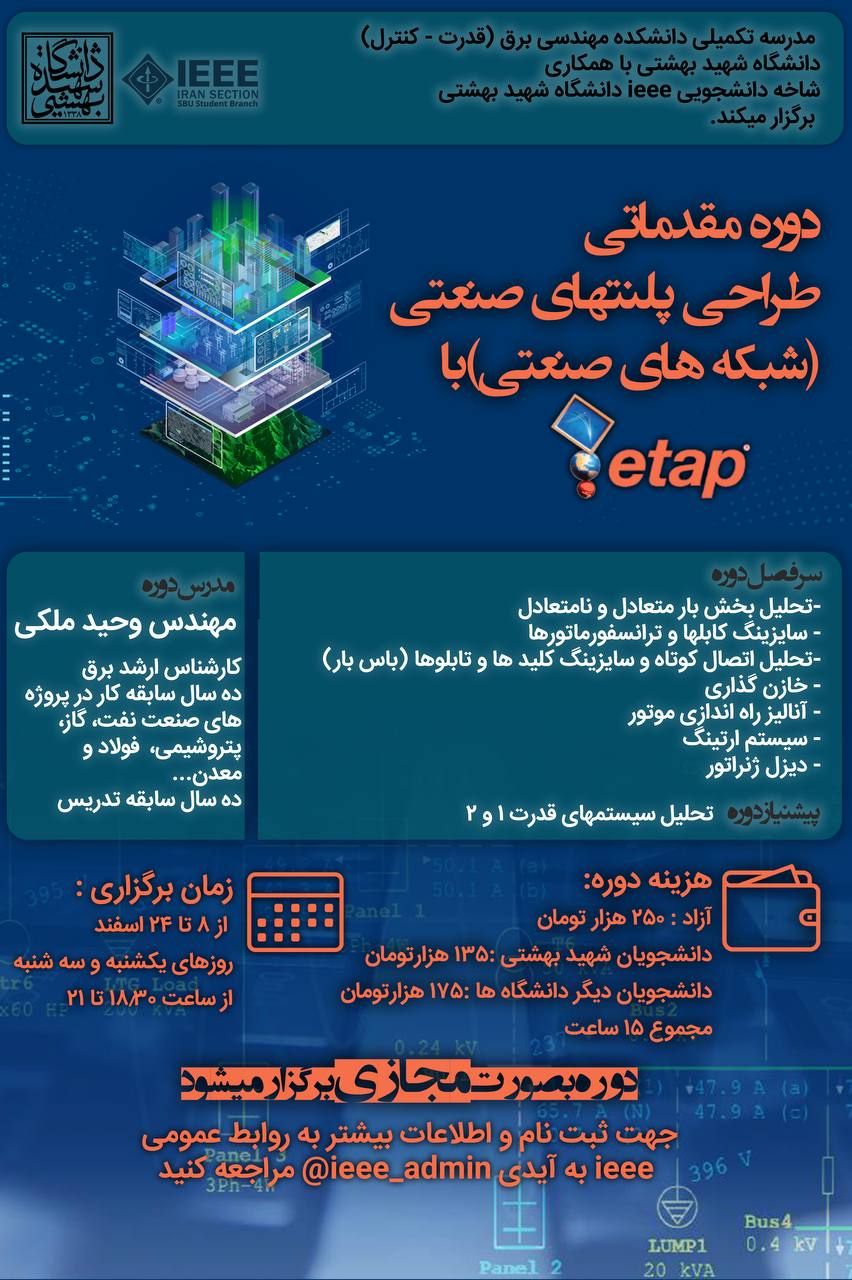مدرسه تکمیلی دانشکده مهندسی برق (کنترل-قدرت) دانشگاه شهید بهشتی با همکاری شاخه دانشجویی IEEE دانشگاه شهید بهشتی، اقدام به برگزاری دوره مقدماتی طراحی پلنتهای صنعتی با نرم‌افزار Etap نموده است که از تاریخ  ۸ الی ۲۴ اسفندماه در حال برگزاری است. شرکت کنندکان در انتهای این دوره مدرک معتبر از دانشکده مهندسی برق (کنترل- قدرت) و شاخه دانشجویی IEEE دانشگاه شهید بهشتی را دریافت خواهند نمود.
