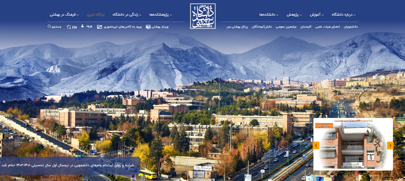 امروزه وبگاه یک سازمان، آینه تمام نمای فعالیت‌ها و جلوه‌گر حیات آن است. پویایی محتوا و به‌روز بودن مطالب، خبر از تحرک و نشاط درونی سازمان به مخاطب می‌دهد. وبگاه فعلی دانشگاه شهید بهشتی، ماحصل پروژه‌ای چندساله است که با پیگیری و همت مدیران مرکز فناوری اطلاعات و ارتباطات، طی این سال‌ها دنبال شده و در سال 1400 به ثمر نشسته است. این مرکز رویکرد متمرکز و جدیدی را برای بازبینی محتوا، و چیدمان مجدد صفحات وبگاه دانشگاه پیشنهاد و طی بیست و ششمین جلسه هیئت رئیسه دانشگاه مورخ 1401/8/10 به تصویب رسانده که در آن چیدمان، ایجاد صفحات و درج محتوا به صورت متمرکز از طریق شرکت پیمانکار با معیارهای روز دنیا انجام خواهد شد.